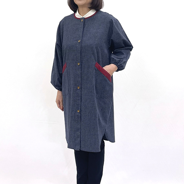 文人柄に赤バイヤスのきいた、ロングタイプのスモックです。