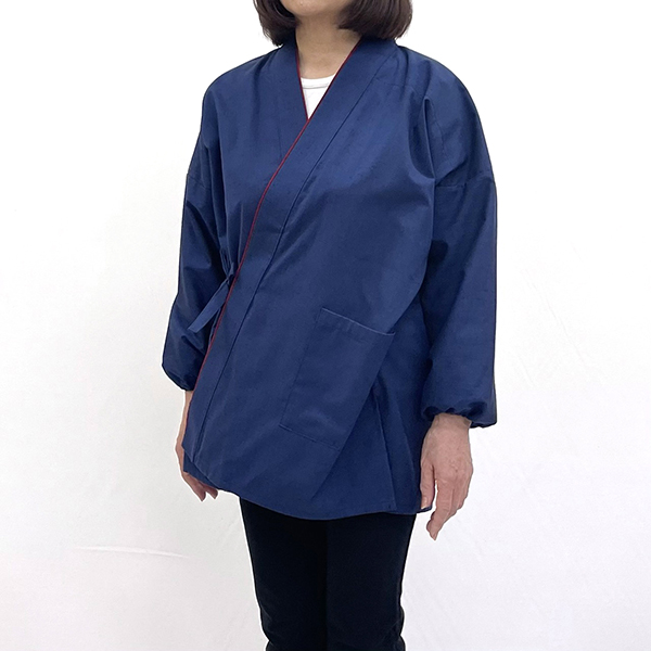 袖口ゴム式・左前にポケット、打ち合わせ(四つ紐)の作りとなります。