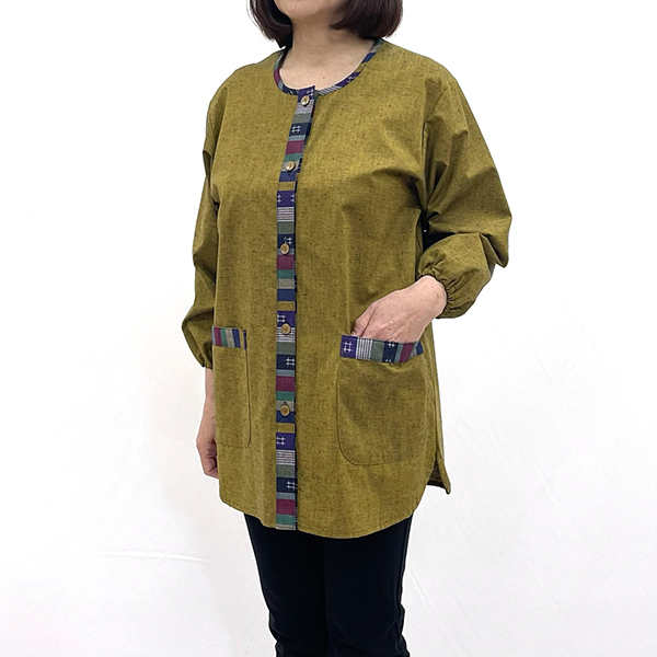 前あきで脱ぎ着がしやすく、前身頃左右にポケット有、袖口がゴムになっています。